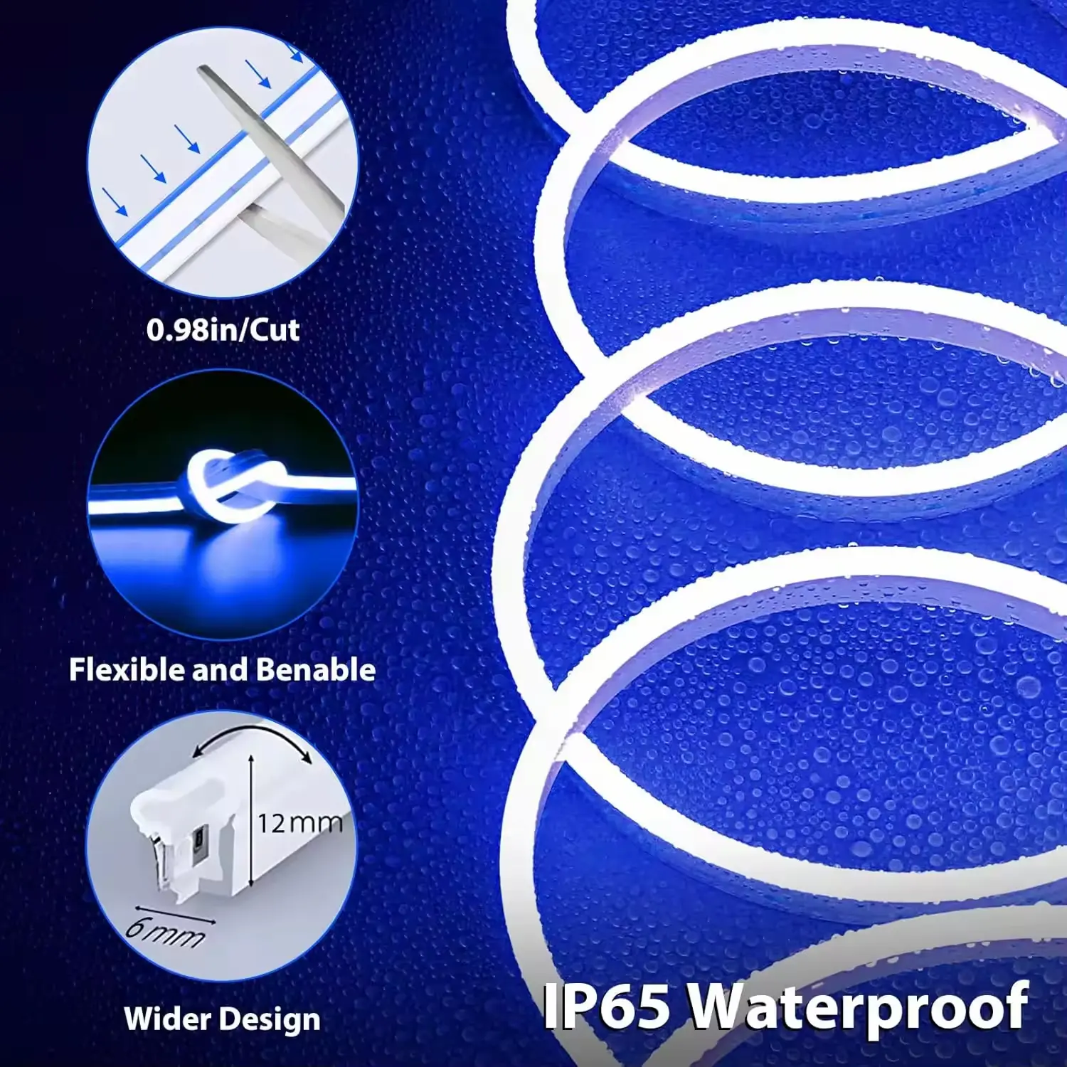 Neonvue Blue LED Neon Flex: 12V DC, 6x12mm, 120LED/m. IP65 waterproof for indoor/outdoor use. Perfect for vibrant lighting in signage, events, and decor. Flexible, durable, and low-power.